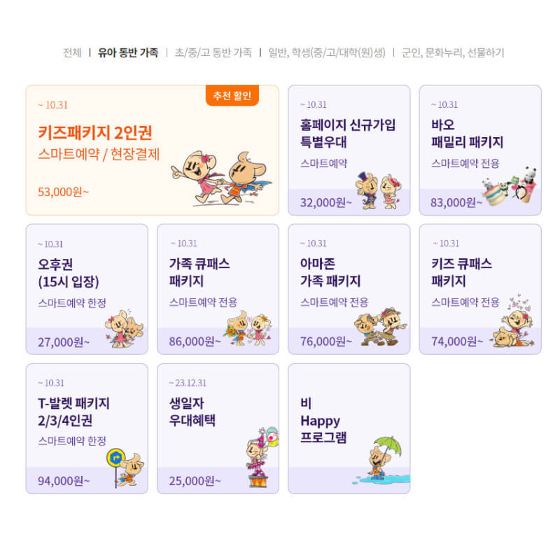 에버랜드는 공식홈페이지에서 매월 각 통신사, 카드사별로 스페셜 프로모션에 대한 정보를 공지하고 있습니다. 유아동반 가족할인, 초·중·고 동반할인 등 월별로 진행하고 있으니 방문 전에 ‘스페셜 프로모션 확인’을 통해 추가할인 혜택 받으시길 바라겠습니다.