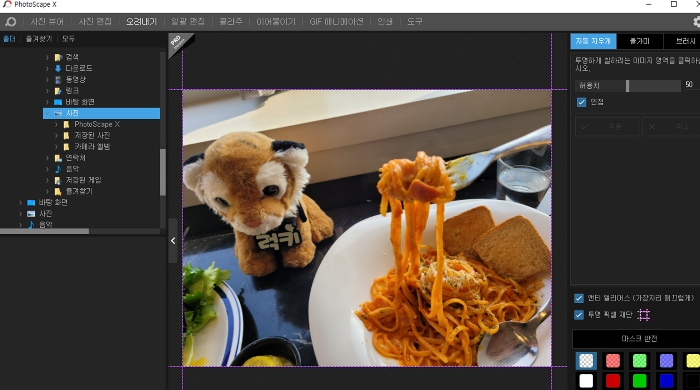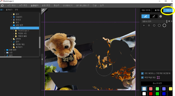 조금 더 섬세한 작업이 필요하다면 브러시를 클릭하여 마치 그림판의 지우개처럼 배경을 제거할 수 있고 크기도 선택할 수 있어 자동 지우개나 올가미보다 더 세밀한 작업이 가능합니다.