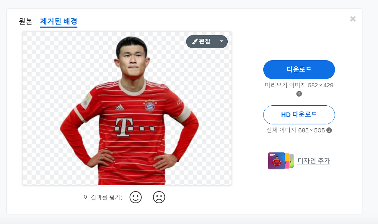 열기 버튼을 클릭하면 아래와 같이 배경이 제거된 이미지를 미리 보기 할 수 있습니다. 여기에서 편집할 필요 없으면 바로 다운로드 버튼을 클릭하면 됩니다.