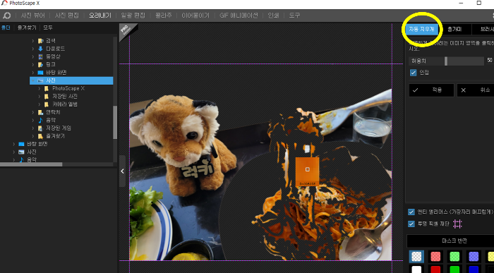 자동 지우개로 제거할 배경을 누르면 비슷한 색계열이 제거됩니다. 만약 제거할 부분이 아닌 곳이 같이 제거된다면 허용치를 줄이거나 늘려서 조절이 가능합니다.