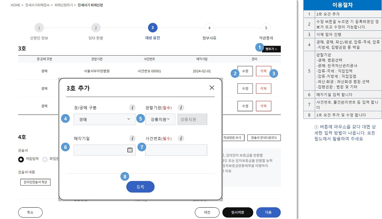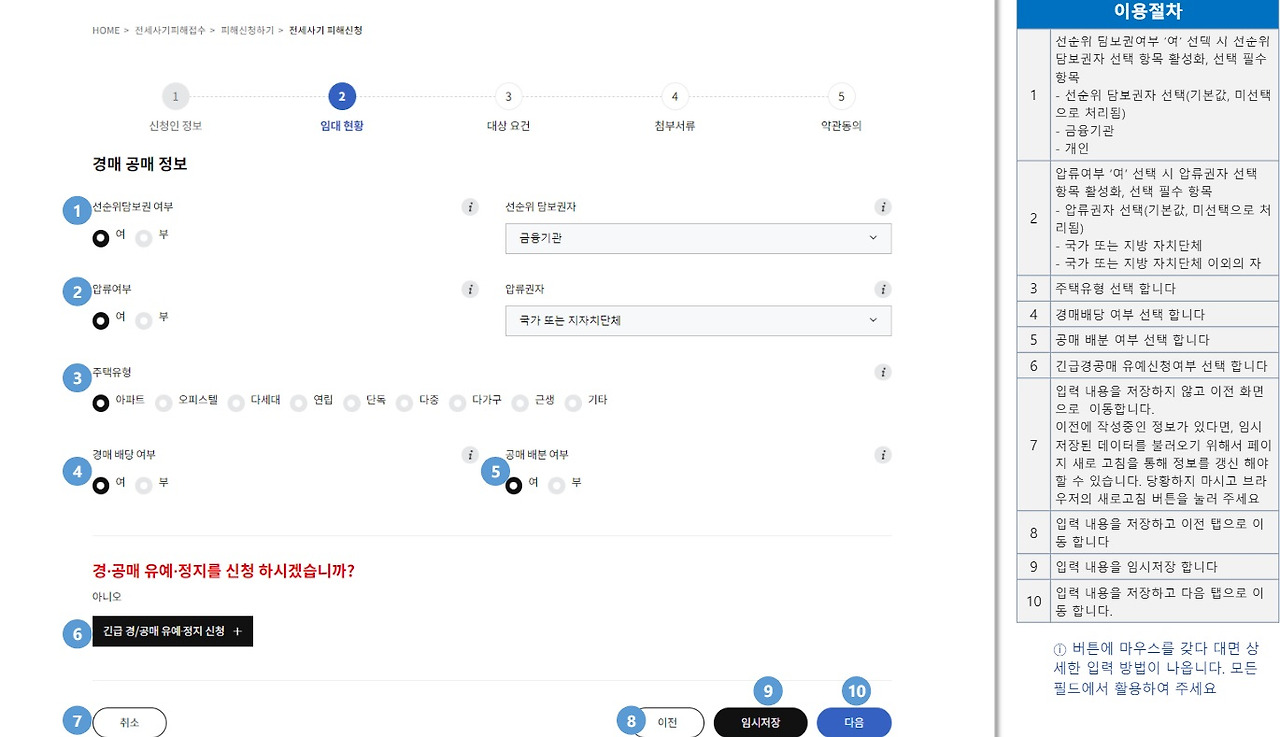 ⑧전입일자, 점유일자, 확정일자 등 대상 요건과 관련된 정보를 입력합니다. 그 다음 페이지에서 경매, 공매, 파산, 압류 등 진행 중인 절차가 있으면 그 내용도 입력합니다.