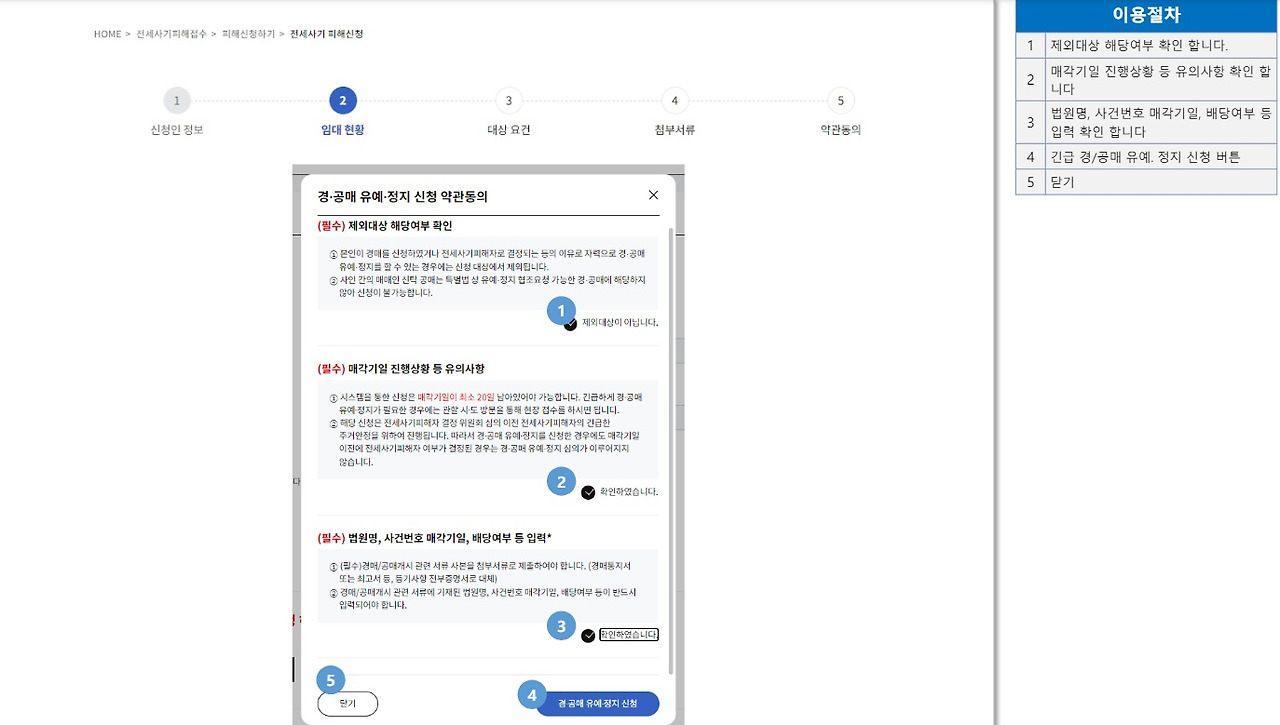 ⑦긴급 경·공매 유예·정지 신청을 할 경우에는 다음 페이지로 넘어가 제외 대상인지를 확인한 뒤 관련 내용을 입력하고 신청합니다.
