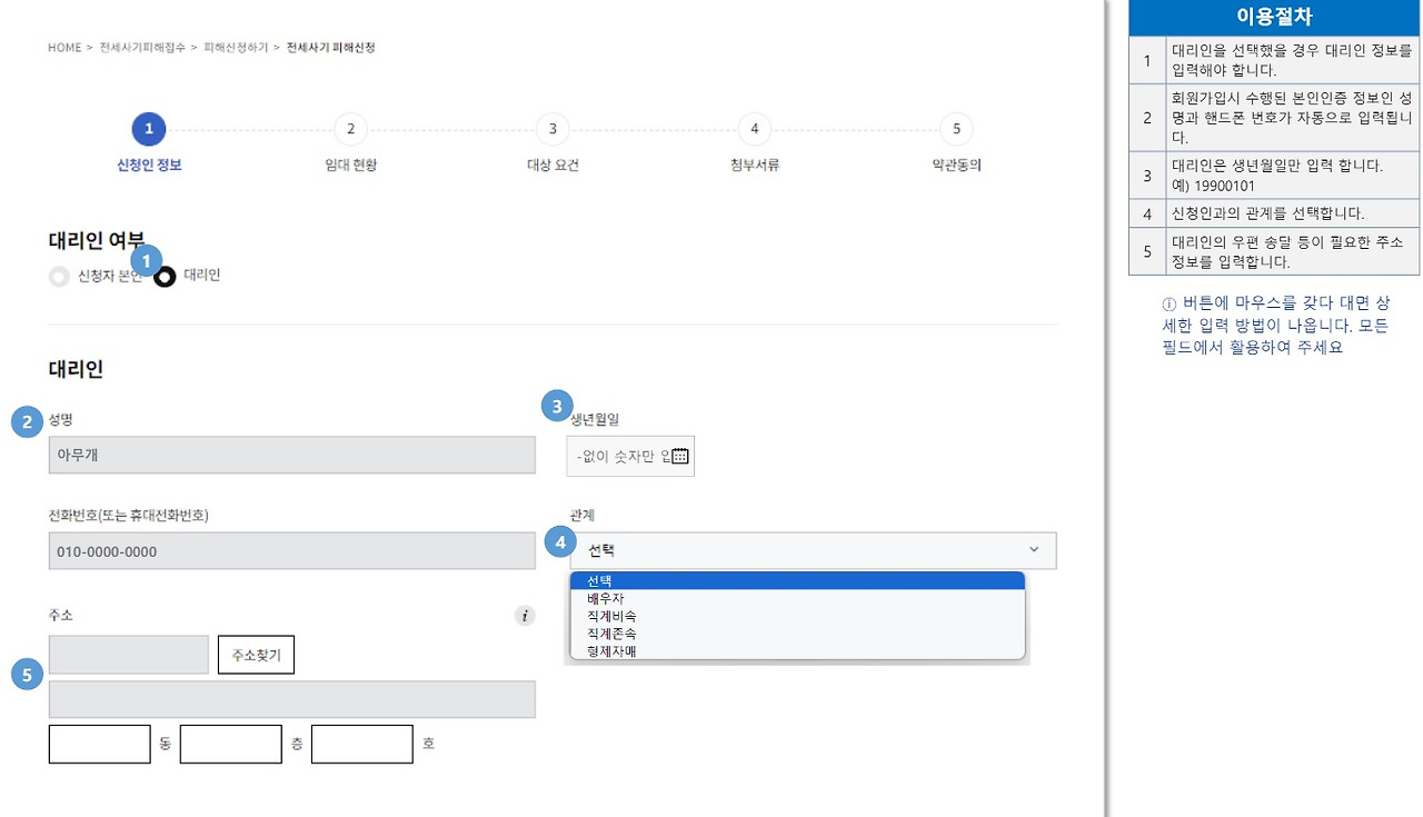 ⑤피해자 본인이 아니고 대리인일 경우 대리인의 인적 사항, 피해자와 관계 등을 입력하고 다음으로 넘어갑니다.