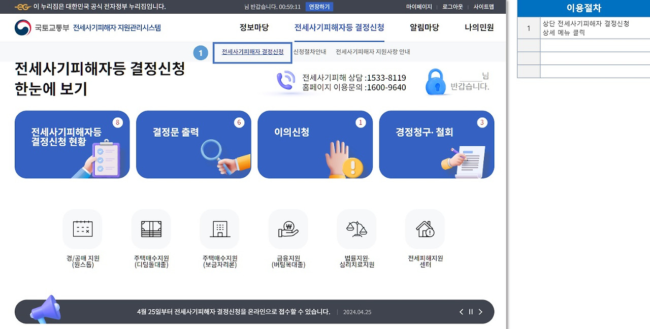 ②다시 홈 화면에서 위쪽 오른편의 ‘전세사기 피해자 등 결정 신청’에 마우스 커서를 올려 ‘전세사기 피해자 결정 신청’을 클릭합니다.