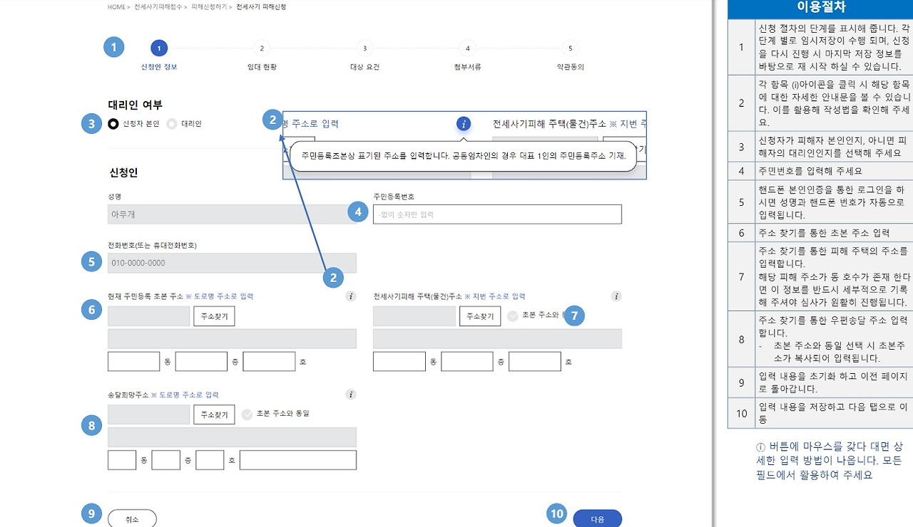 ④자신의 이름, 주민등록번호, 전화번호, 주민등록초본 주소, 전세사기 피해 주택 주소, 송달 희망 주소 등을 입력하고 다음을 누릅니다.