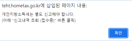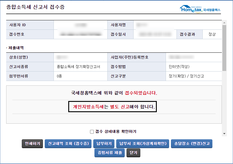 마지막으로 신고서 접수증을 다시 확인하고 위 내용에 따라 개인지방소득세 별도 신고를 진행하시면 됩니다.