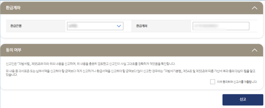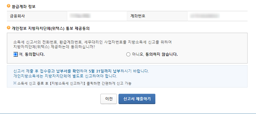 신고서 제출 내용과 환급계좌 정보 확인 후 개인정보 지방자치단체(위택스) 통보 제공동의를 체크하고 신고서 제출하기 클릭