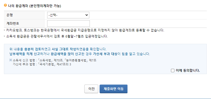 내용을 모두 확인한 이후 기나부세액이 마이너스로 되어 있다면 환급대상자로 하단에 환급계좌를 입력하고 내용 검토에 대한 동의를 체크한 후 하단의 제출 화면 이동을 클릭합니다.