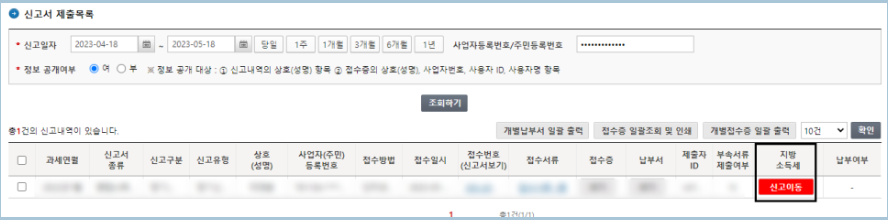 신고서 제출 목록 조회 후 우측 하단의 신고 이동 클릭